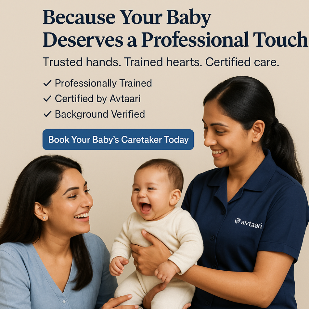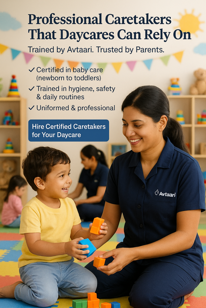 Every Avtaari caretaker goes through professional training, certification, and hygiene protocols—so your baby receives not just care, but the best care. Whether you are a mother seeking peace of mind or a daycare/Creche looking for reliable staff, Avtaari offers skilled, uniformed, and background-verified caretakers you can trust.